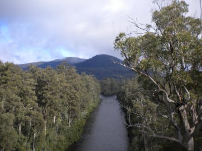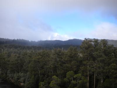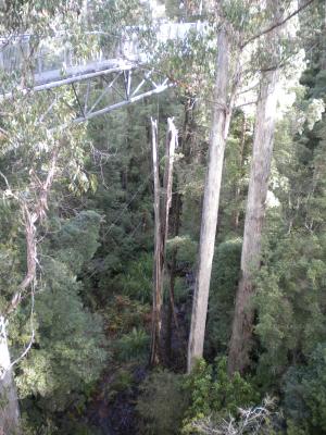 Heute haben wir zum ersten Mal den typischen Regenwald von Tasmanien erkundet. Dazu haben wir einen Weg ausgesucht, der sich "Air Walk" nennt. Und der Name ist Programm. Der Weg verläuft über Hängebrücken, die bis zu 37 Meter (Fehler vorbehalten) über dem Boden hängen. Aber dementsprechend sah auch der Ausblick aus.