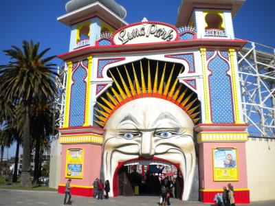 Nach einer anstrengenden Anfangsphase haben wir uns heute mal Melbourne von der sonnigen Seite angeschaut. Im Endeffekt kann man sich in St. Kilda eine Handvoll an Dingen ansehen: Für die Cafégänger die Fitzroy- und Acland Street; Für die Strandspaziergänger die Promenade und schließlich für das Kind im Manne: der Luna Park am Meer.